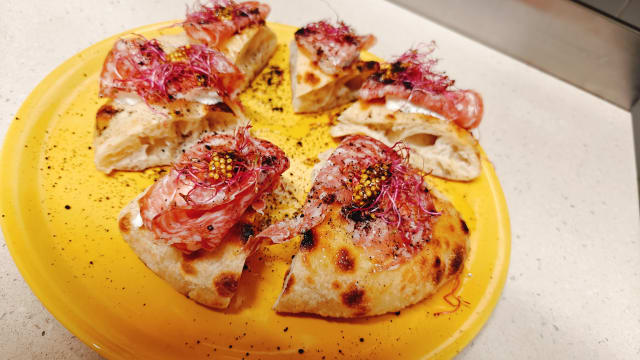 Crema di carciofi,prosciutto crudo,bufala, erba cipollina,carciofini