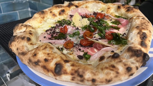 Fior di latte, prosciutto crudo irpino, rucola, scaglie di parmigiano 36 mesi, piennolo dop del vesuvio semidried e olio extra vergine d’oliva cilentano dop