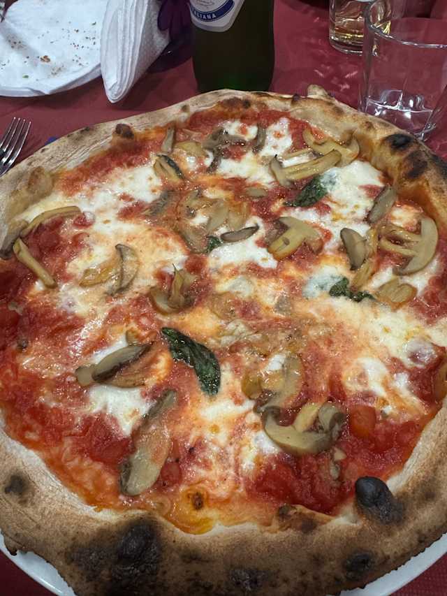 - Pomodoro, mozzarella, prosciutto cotto, funghi, salsiccia