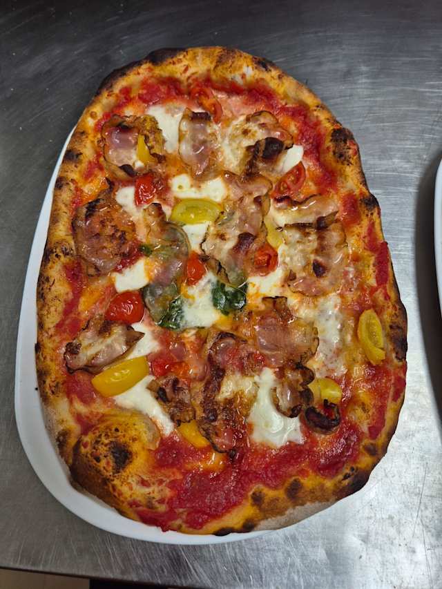 - Mozzarella, uovo crudo in cottura, pancetta, pecorino romana pepe