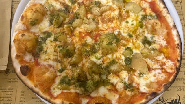 Pom. mozz., olive, origano, porcini, crema di tartufo