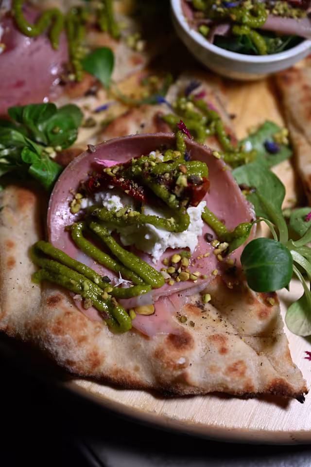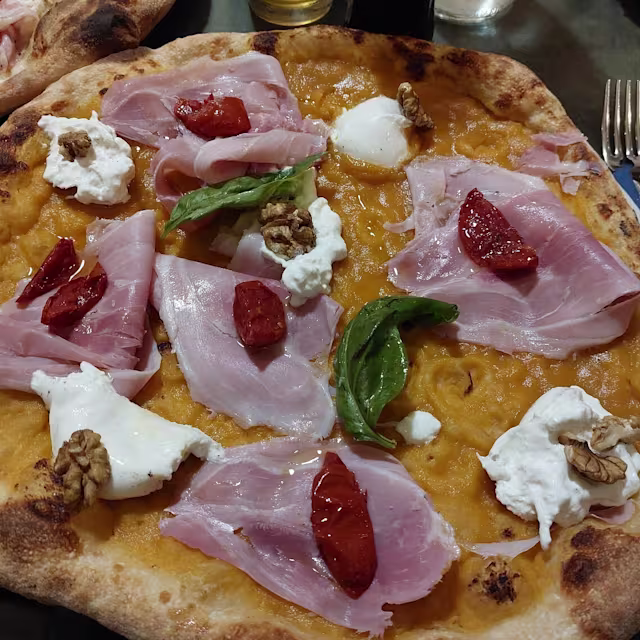 - Prosciutto crudo starvaggl sant'angelo di brolo, pomodoro san marzano dell'agro sarnese nocerino DOP, scagile di parmigiano regglano, agilo, ollo evo DOP, origano