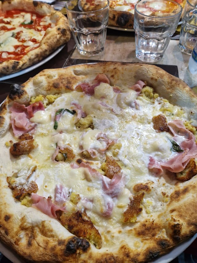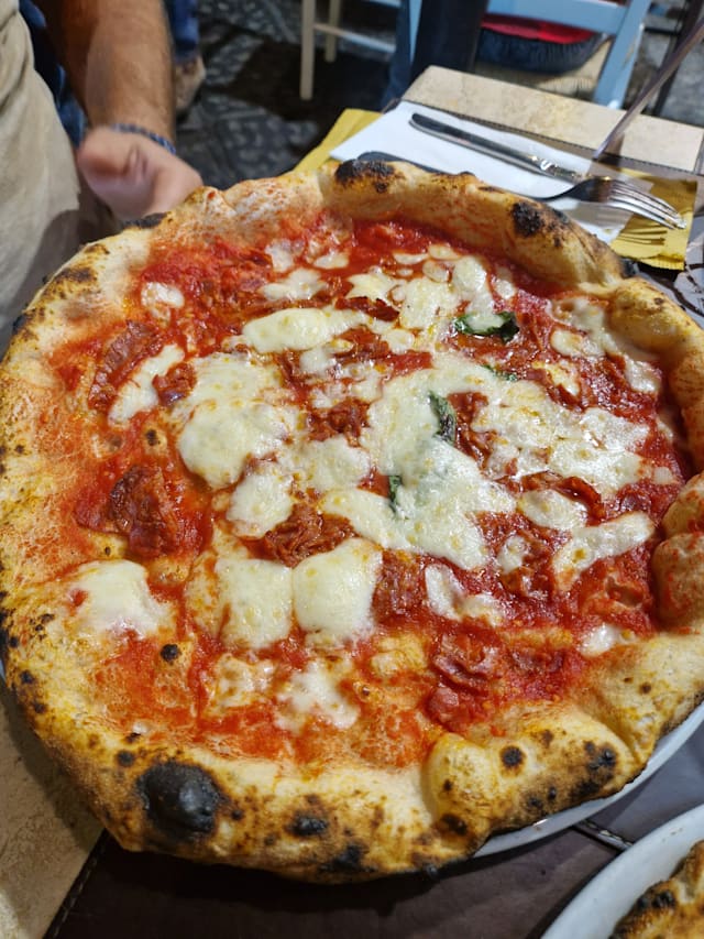 Pomodorino datterino siciliano, mozzarella di bufala campana dop, metà cornicione ripieno di salsiccia e friarielli metà prosciutto cotto e provola affumicata