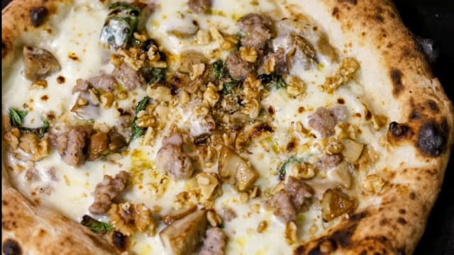 (crema di zucca, fior di latte di agerola, blu di bufala, salsiccia paesana trentolese, basilico, olio evo del matese)