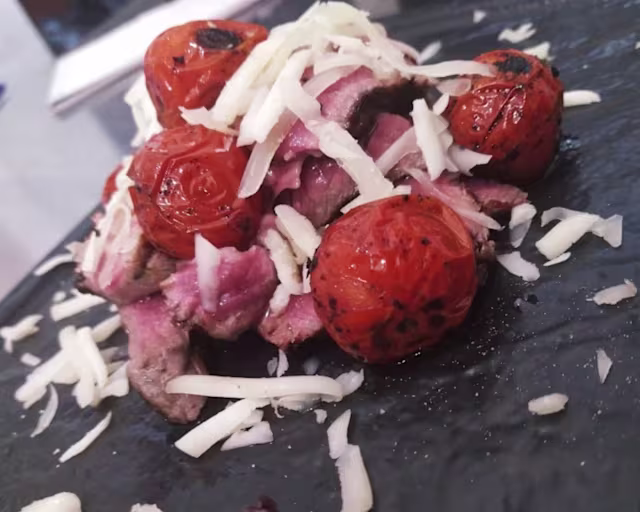 - Crema di zucca, bufala D.O.P., speck croccante, pachino infornato.