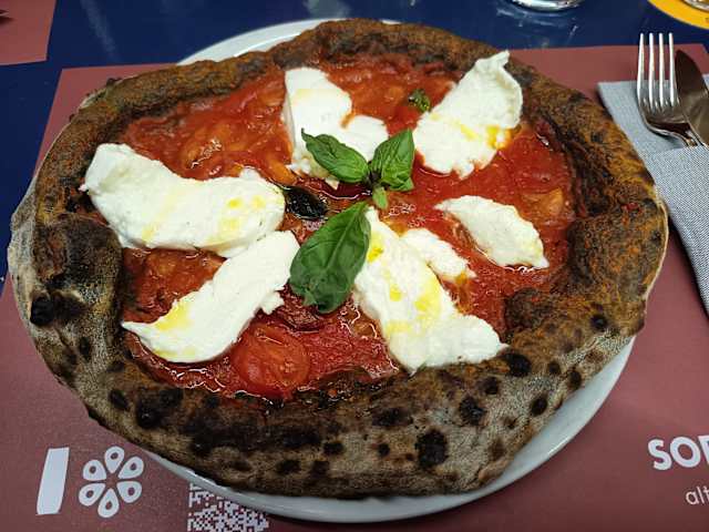 - Pomodori ciliegini colorati cotti a bassa temperatura per lunghe ore, nozzarella di bufala, basilico e olio evo - con impasto al carbone