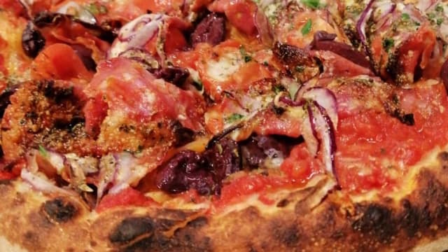 - Pomodoro, salame piccante, olive, mozzarella, prezzemolo
