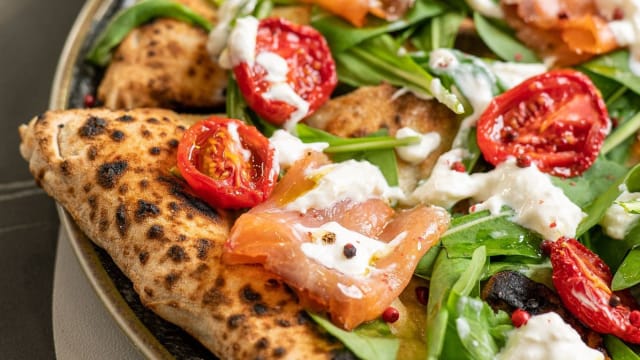 - Ripieno aperto,rucola fresca,prosciutto crudo San Daniele 24 mesi,pacchetelle rosse del piennolo,scaglie di parmigiano reggiano 24 mesi,fonduta di parmigiano reggiano 24 mesi, ,olio e.v.o.