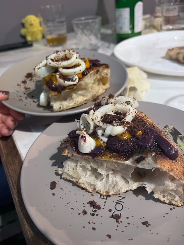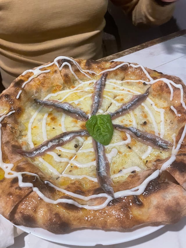 Pizza doppia cottura, crema di bufala al miele, alici, guanciale iberico(patanegra) croccante