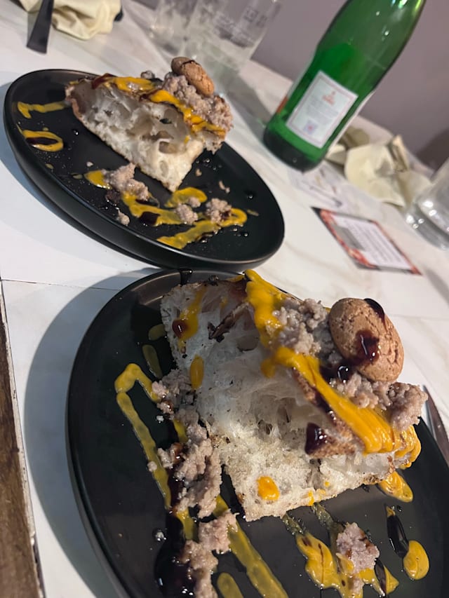 Focaccia con sugo alla amatriciana, guanciale croccante, pecorino e pepe.