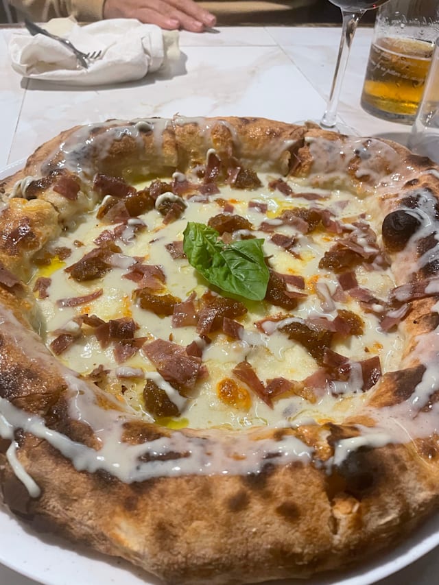 Pizza doppia cottura, crema di pecorino, confettura di fichi bianchi, lardo di patanegra