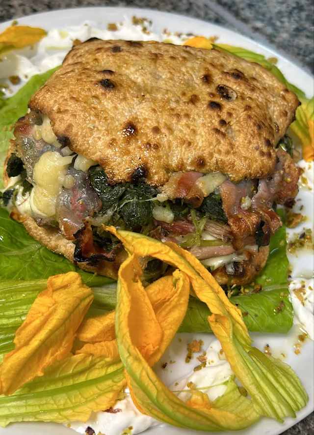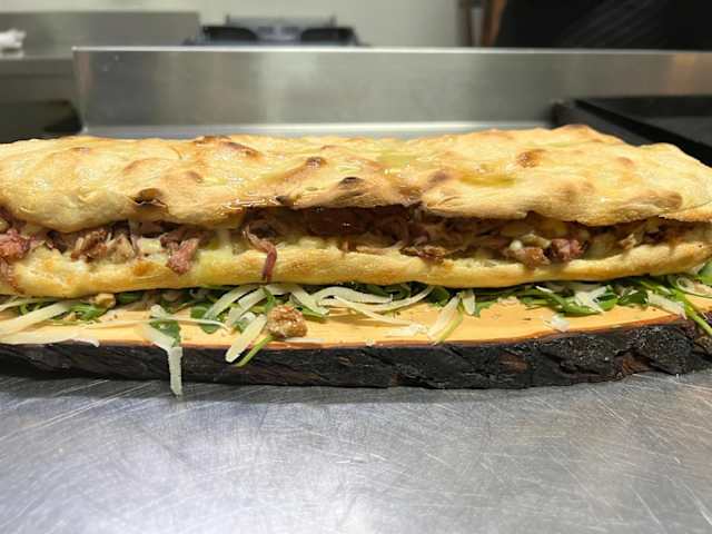 - Mortadella, crema ceci, stracciata, pistacchio e caffé