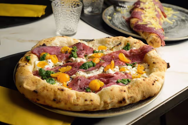 - Pomodorino del piennolo, fior di latte d'agerola, all'uscita rucola, pancetta, veli di parmigiano reggiano