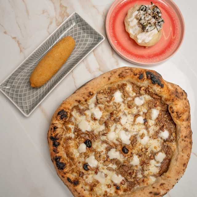 - Porchetta di ariccia, fior di latte di agerola, chips di patate, fonduta cacio e pepe