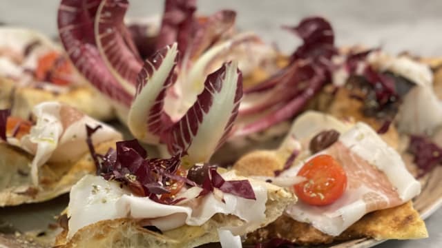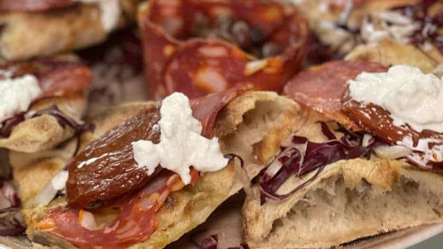 Primo spicchio : base rucola, lardo, miele, nocciole e rosmarino. Il secondo spicchio: base rucola, stracciatella, pistacchi tostati e basilico. I terzo spicchio : base rucola, burrata e prosciutto crudo di parma. L quarto spicchio : base rucola, mozzarella di bufala, capocollo, semi di sesamo, olio
