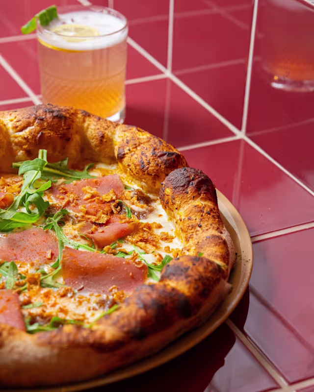 - Pomodoro pelato italiano gustarosso (schiacciato a mano come da tradizione), cornicione ai semi di chia, cime di rapa alla salentina (home made), capocollo al vincotto (salumificio giannelli), fonduta di cacio e pepe, basilico fresco.