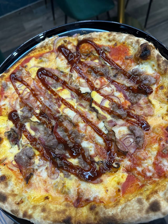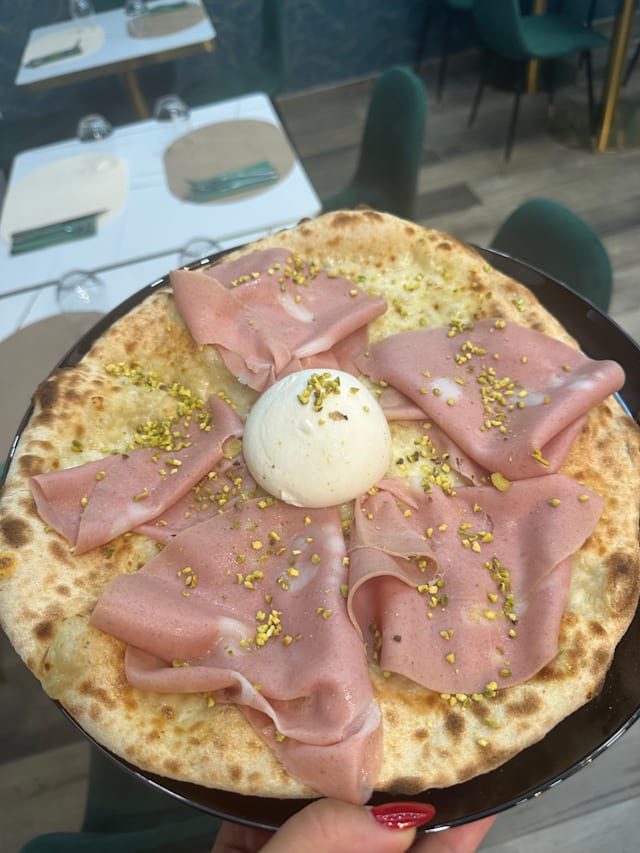 Base pomodoro, salsiccia di bra, burrata, olive taggiasche, basilico, olio extra vergine