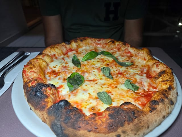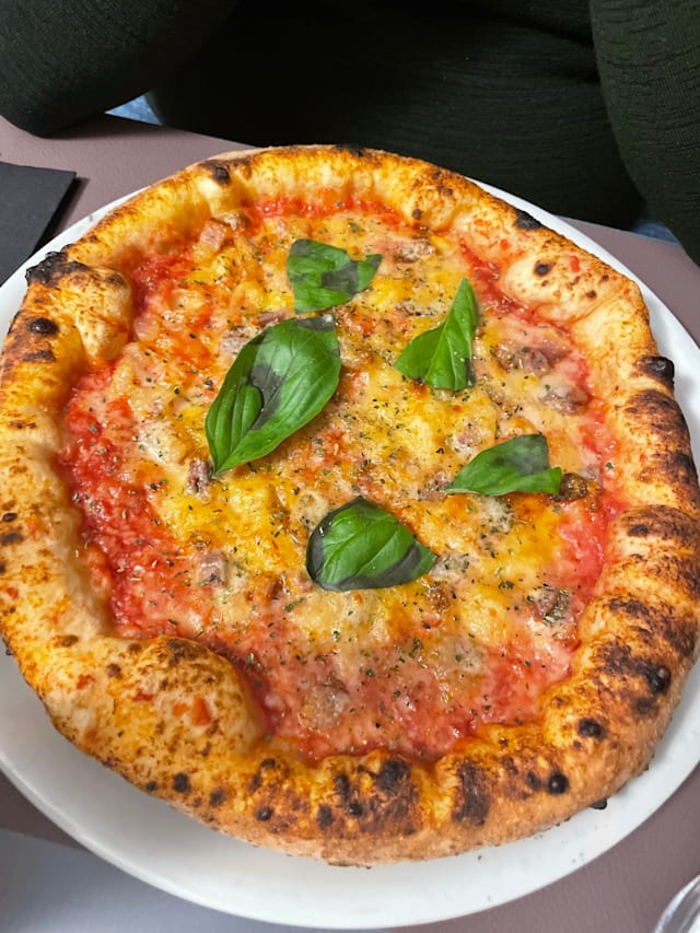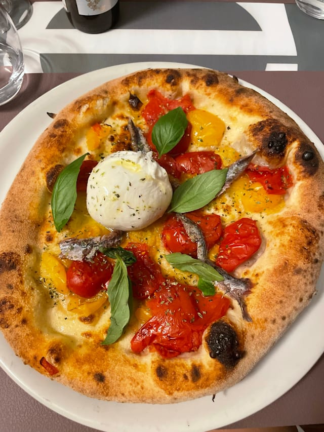 Fiordilatte di agerola, pomodoro san marzano DOP, spianata piccante calabra, fili di peperoncino, basilico e olio EVO pregio delle colline salernitane DOP