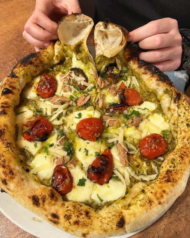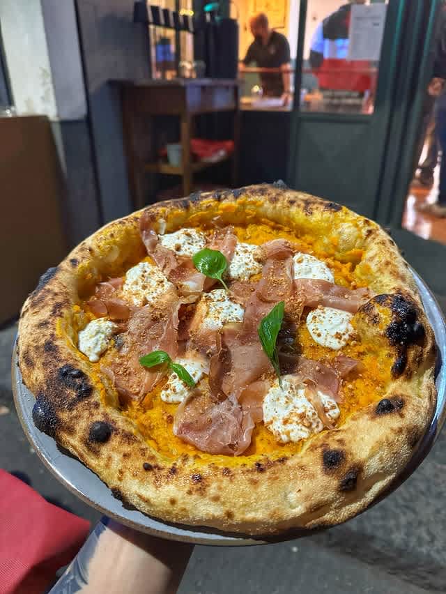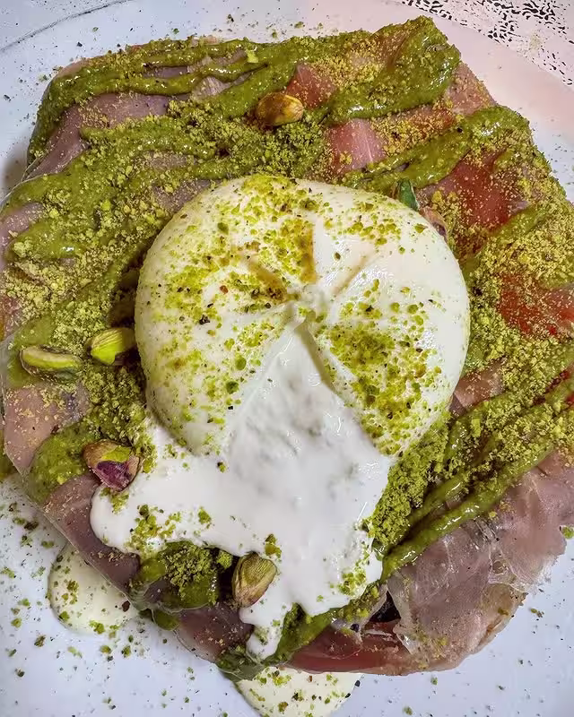 - Base: crema di pistacchio, cipolla, salsiccia Top: crudo siciliano, burrata ripiena di pistacchio, pesto di pistacchio, farina di pistacchio