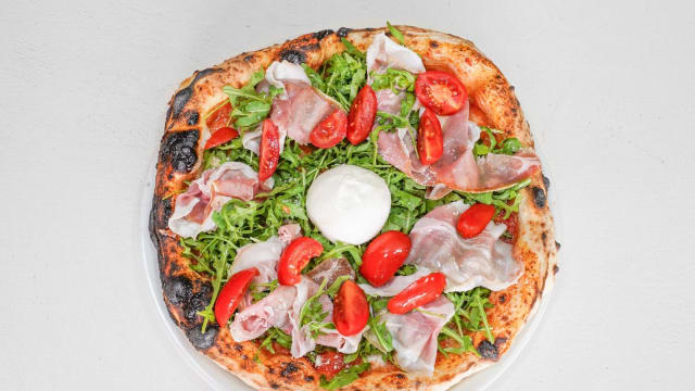 Pom., burrata, rucola, crudo di parma, pomodorini