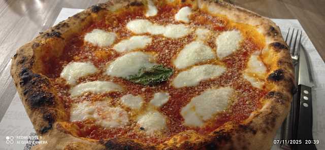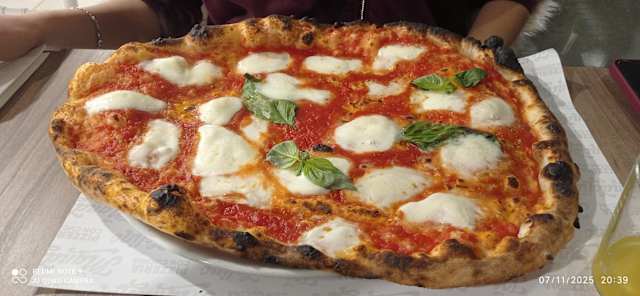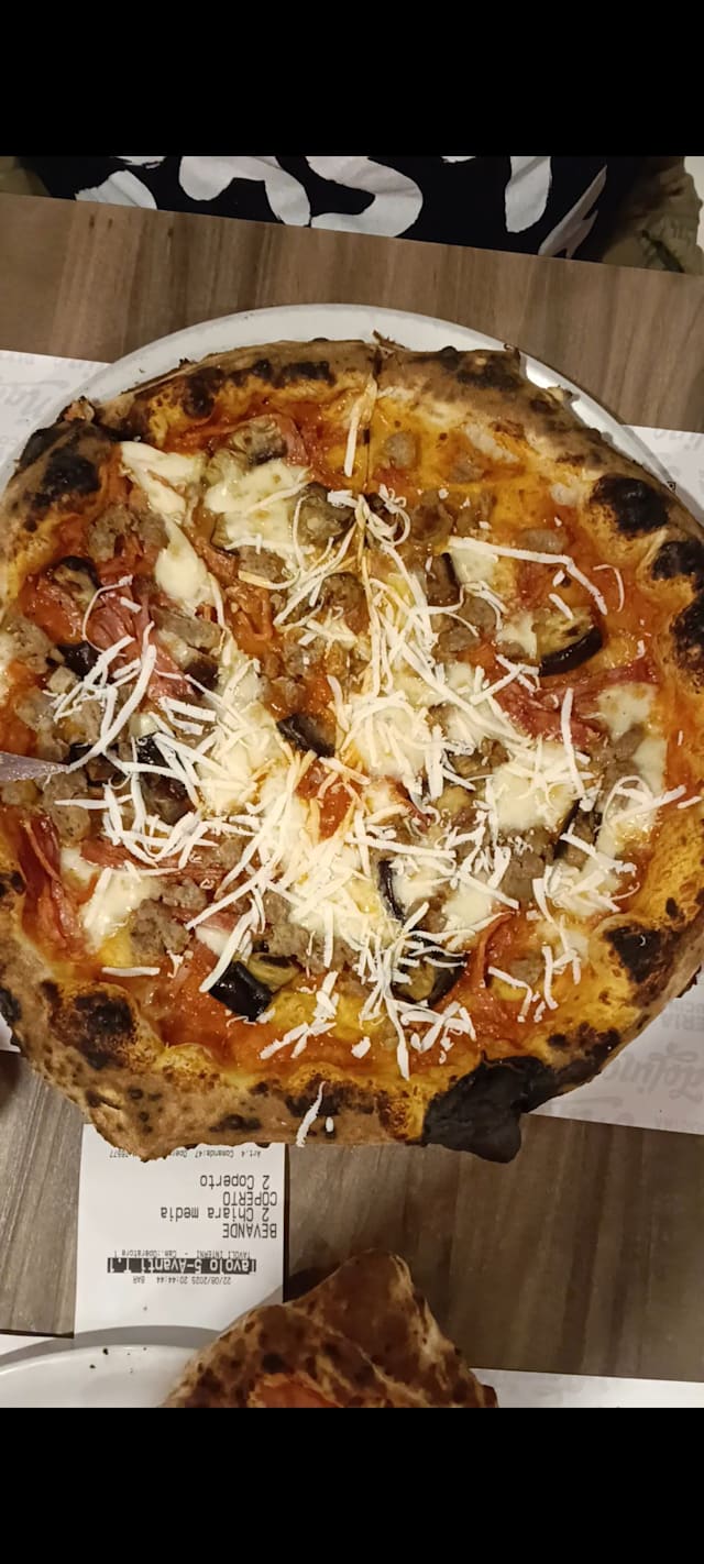 Salsa di pomodorini, provola, melanzane a funghetto, salame leggermente piccante, salsiccia a punta di coltello, ricotta salata e basilico.