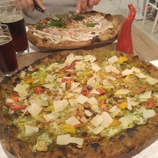 Pesto di rucola, fior di latte, prosciutto crudo di parma, pomodorini è scaglie di grana