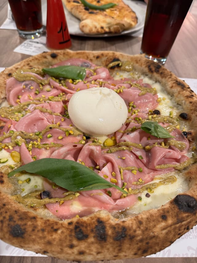 Fior di latte, mortadella, pesto di pistacchio, granella di pistacchio, burrata di andria da 125 gre basilico