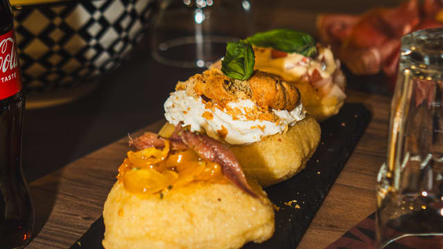 1 x pomodorino giallo semi-dry e acciughe 1 x ricotta di bufala e tarallo napoletano "nzogna e pepe" 1 x crema cacio e pepe, pancetta