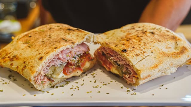 Carne de ternera empanada, frita y gratinada al horno con mozzarella, salsa de tomate, jamón cocido italiano y albahaca. Servida con patatas fritas