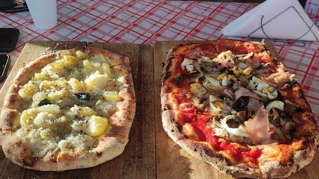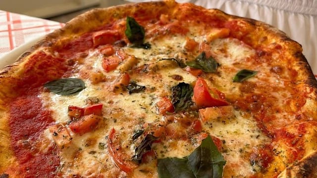 Pomodoro mozzarella funghi pocini salame piccante emmental granella di pistacchio