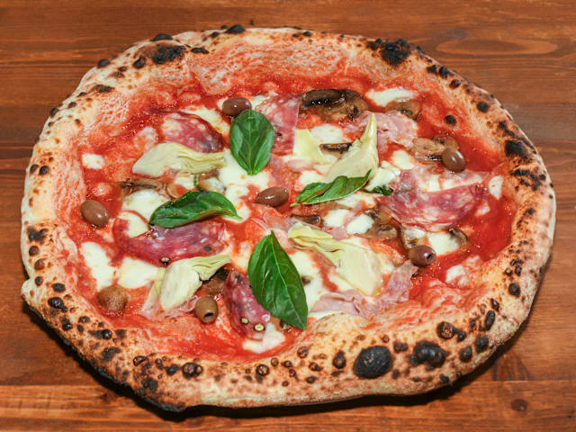 (Pomodoro, fior di latte di agerola, carciofini, olive, prosciutto cotto, funghi)