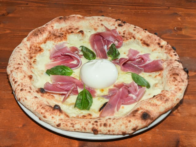 (Fior di latte di agerola, pomodorini, rucola, burrata, prosciutto crudo, grana)