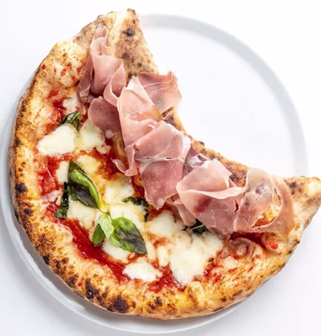 - Pomodoro san marzano DOP, mozzarella di bufala DOP, prosciutto crudo, pomodoro pachino, scaglie di grana e manico ripieno di salame napoli, funghi champignon e basilico