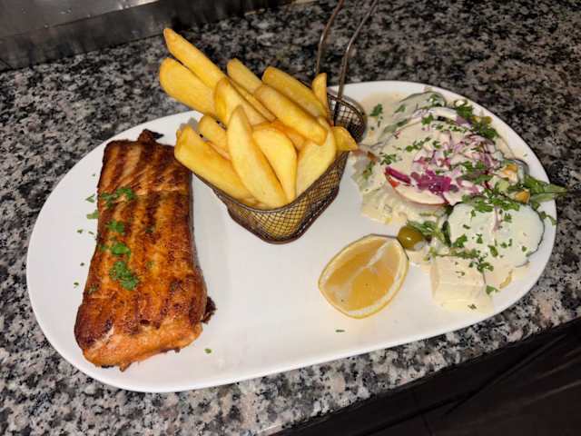 - Filet de saumon grillé, sauce tartare, frites et salade