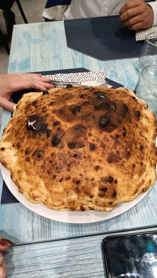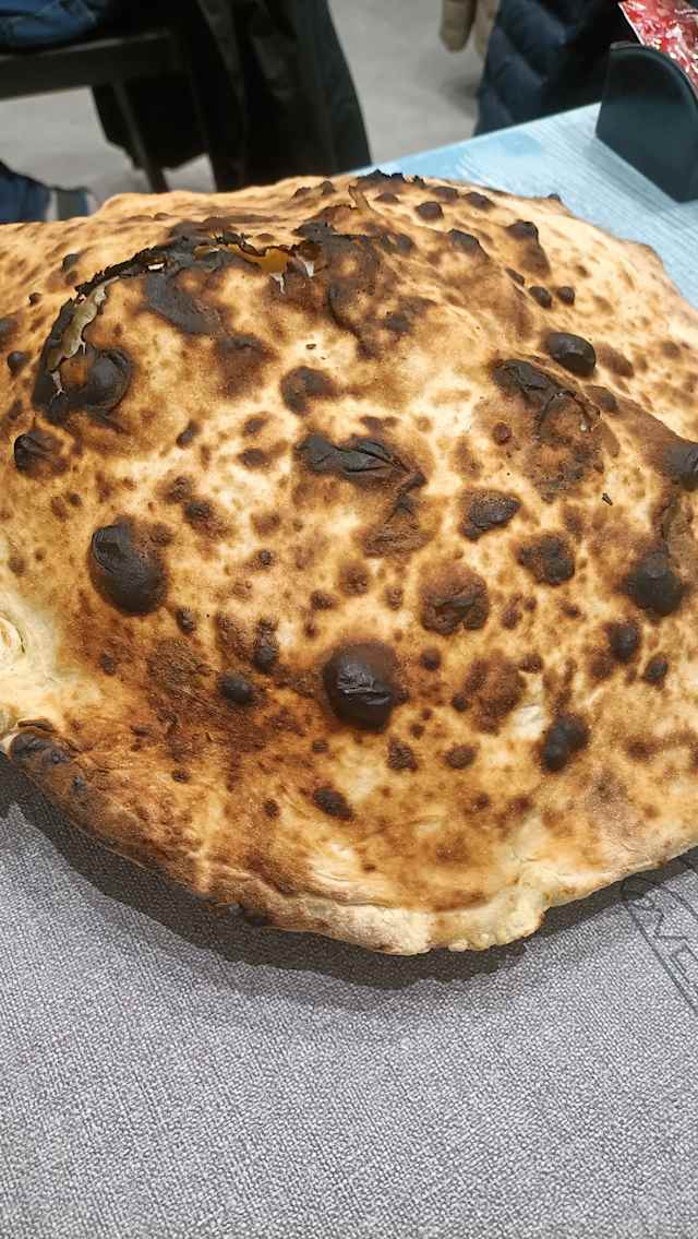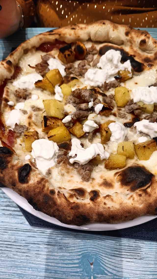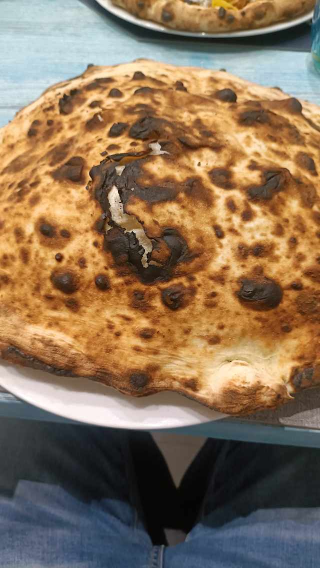 Cornicione ripieno di pancetta e stracciata di bufala, fior di latte, patate al forno, salsiccia, e stracciata di bufala, olio