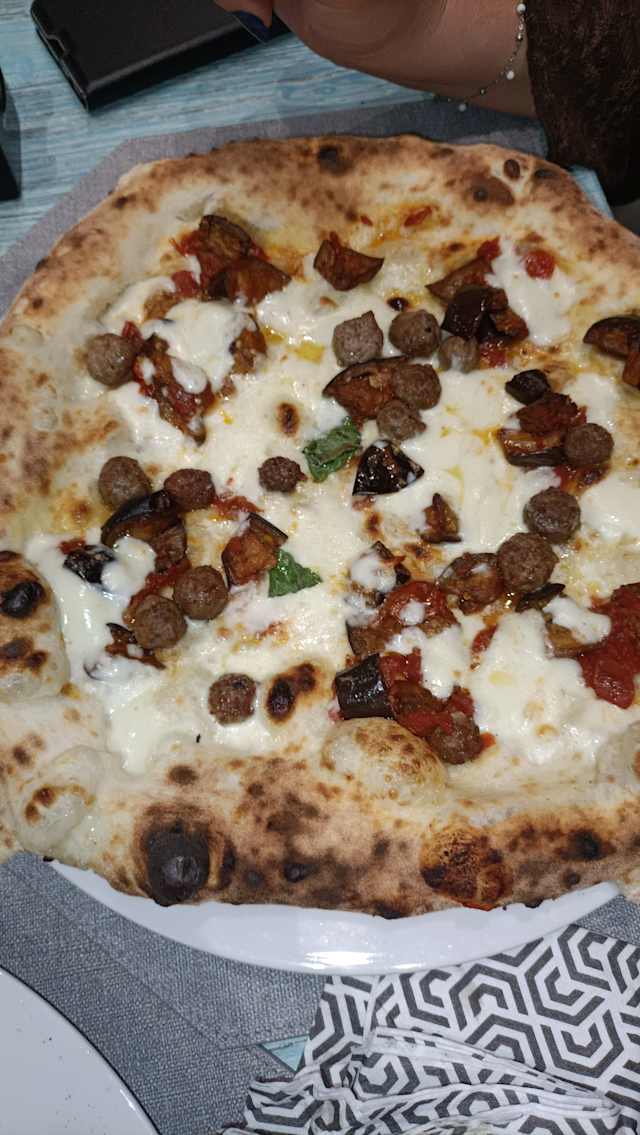 Focaccia con ragù, ricotta di bufala, polpette fritte, pepe, scaglie di parmigiano, basilico, olio