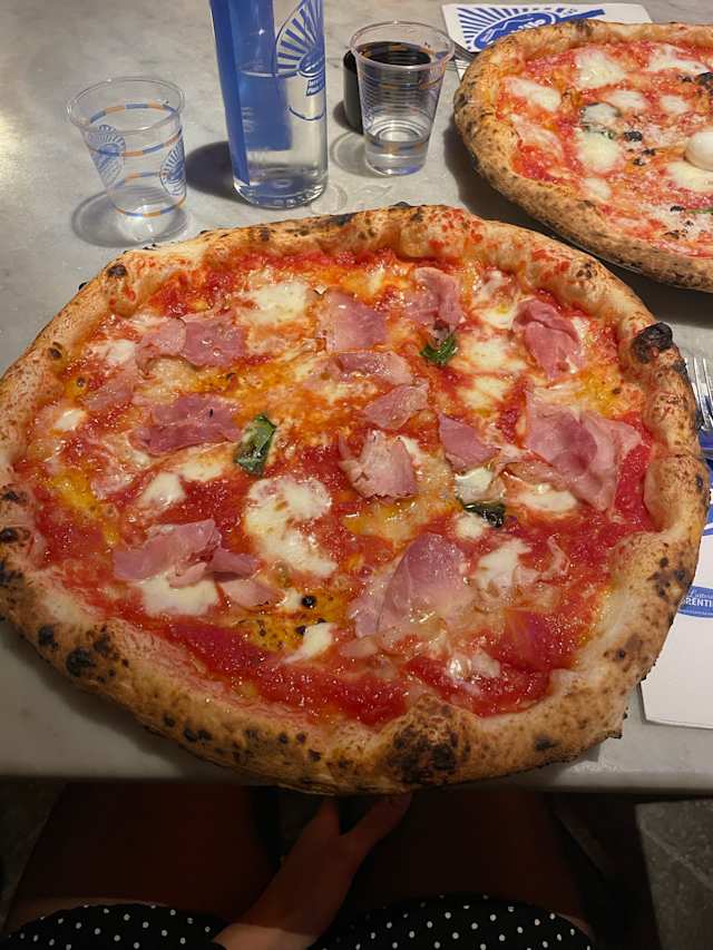 - Pomodoro, fior di latte di agerola, prosciutto cotto e stracciata pugliese di latte di mucca (messi all'uscita dal forno), cremoso di scaglie di cacioricotta stagionata sul cornicione, olio evo del cilento e basilico