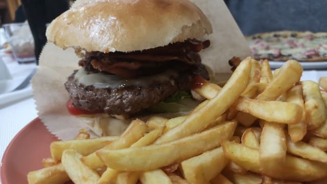 (carne di pecora 200g, insalata, pomodoro, crema di pecorino, cipolla caramellata, salsa burger) serviti con patatine