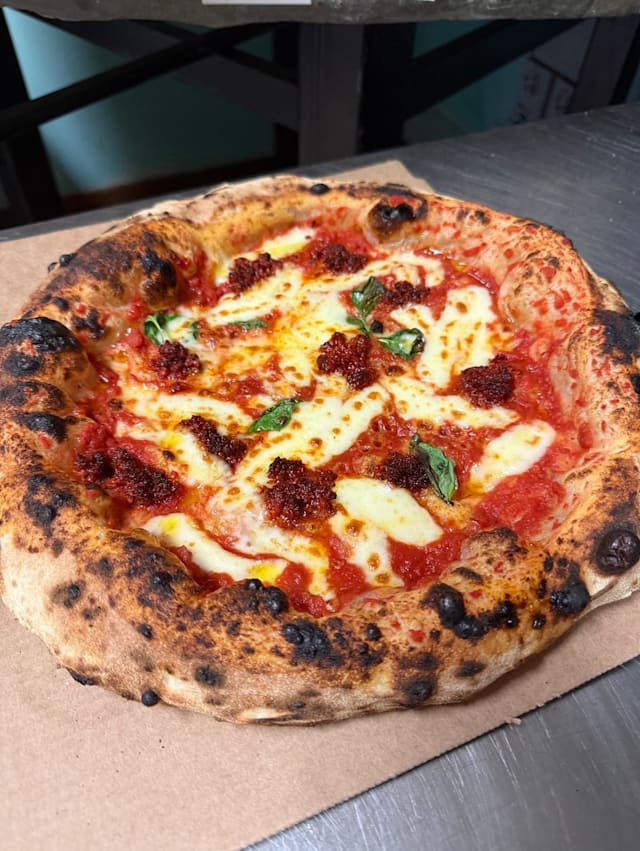 Fior di latte, gorgonzola dolce, salamino piccante, basilico, olio EVO decisa, cremosa e senza mezze misure