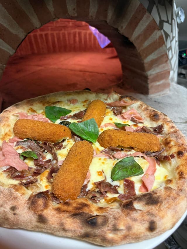 Provola, zucchine fritte, polpettine, stracciatella, basilico, olio evo la magia di nerano in una pizza