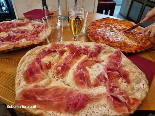 - Pomodoro pelato italiano, fior di latte, fontina, salsiccia di bra a crudo (in uscita), gocce di aceto balsamico