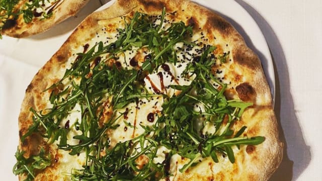- Salsa di pomodoro, n'duja, pesto di basilico, burratina
