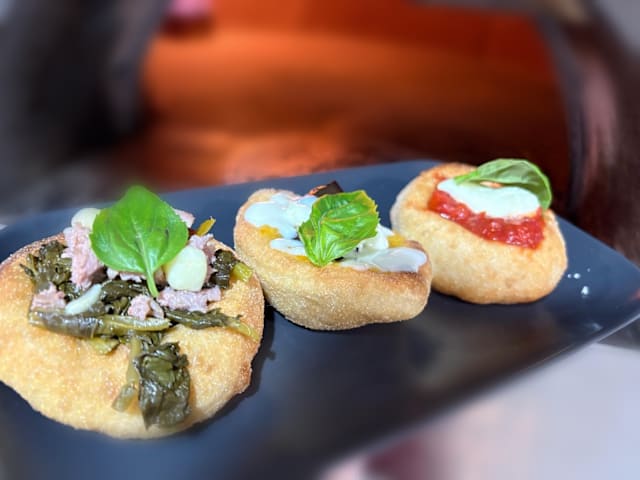 Provola di agerola, prosciutto cotto, pepe, crocchè di patate, basilico, olio evo