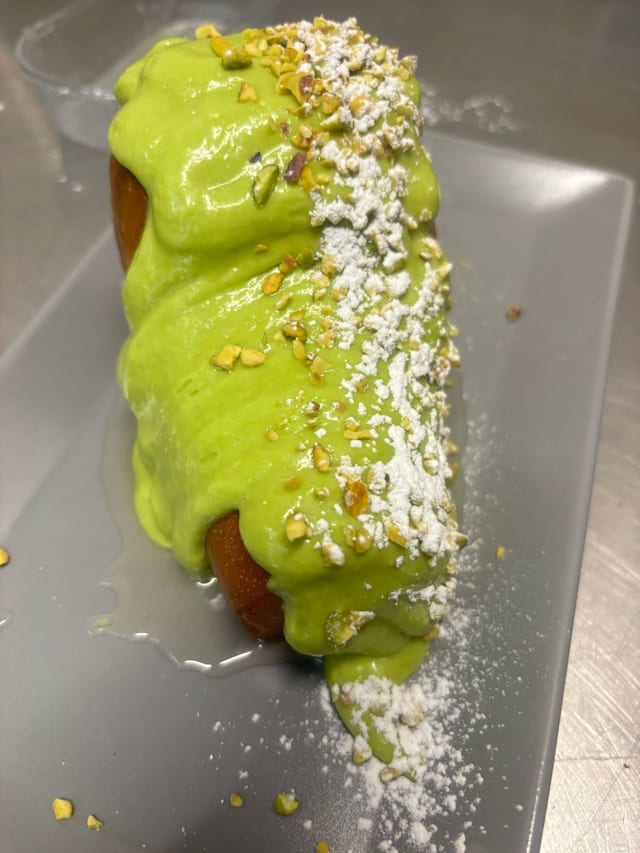 Provola affumicata, mortadella, stracciatella di bufala, crema di pistacchio, granella di pistacchio, basilico, olio evo