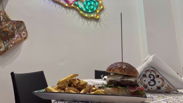 - Mortadella grigliata, hamburger 140g, pesto di pistacchio, pomodoro a fette, mozzarella di bufala e rucola