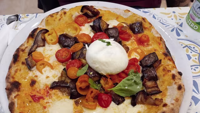 - Pomodoro, mozzarella, prosciutto cotto, melanzane, caciocavallo, olio piccante e funghi