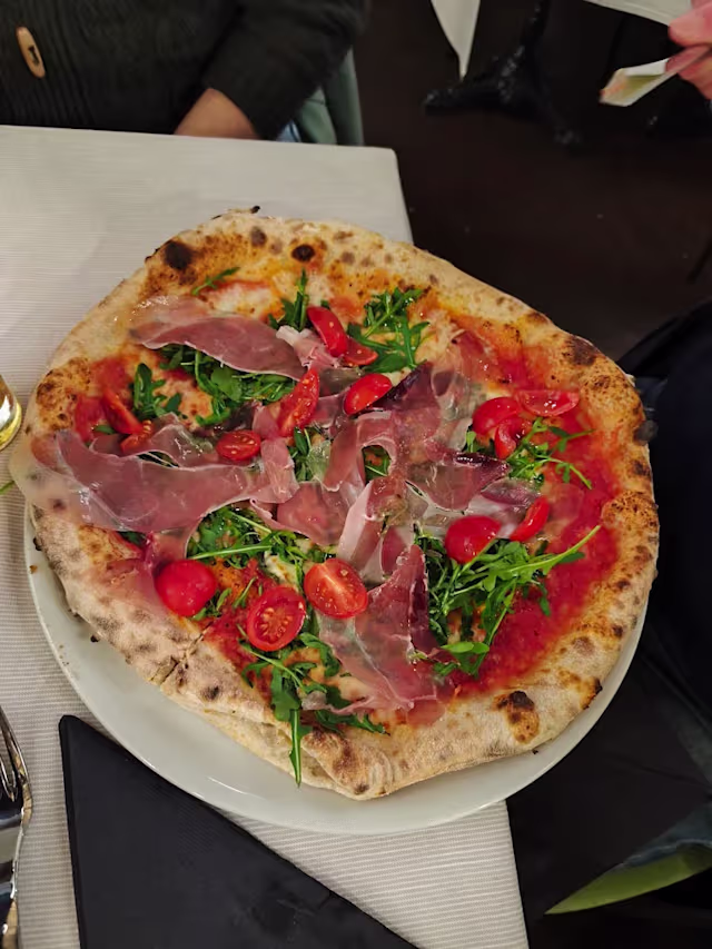 - Pomodoro, fior di latte, burrata, rucola, prosciutto crudo