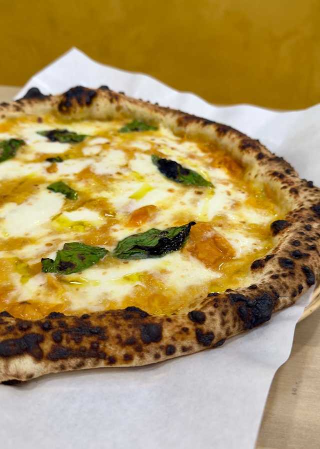 - Fiordilatte - passata pomodoro giallo - cinta senese - porcini – provolone del monaco - fili di peperoncino
