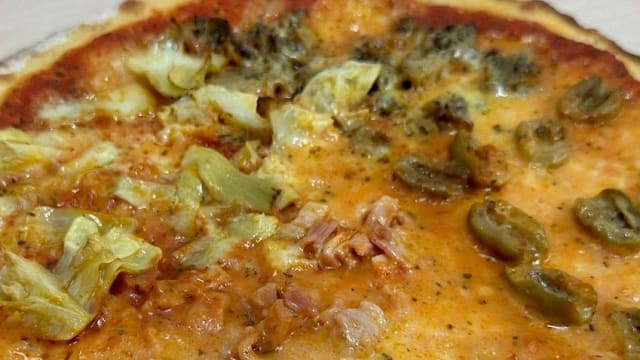 Pomodoro , salame artigianale di spilinga piccante , olive nere denocciolate , grana padano dop (infornato) , cipolla rossa -------in questa pizza non vi è mozzarella