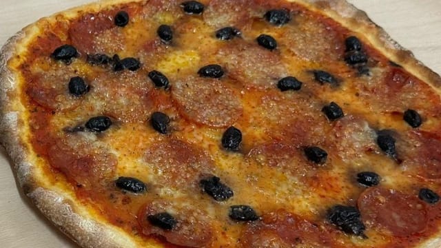 Pomodoro , mozzarella fior di latte , salame piccante artigianale di spilinga , olive nere denocciolate